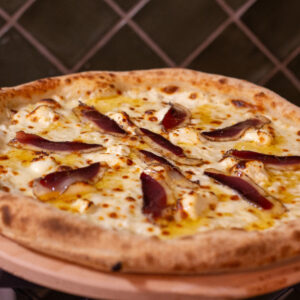 Après cuisson: roquette, coppa, Grana padano DOP, crème de vinaigre balsamique.